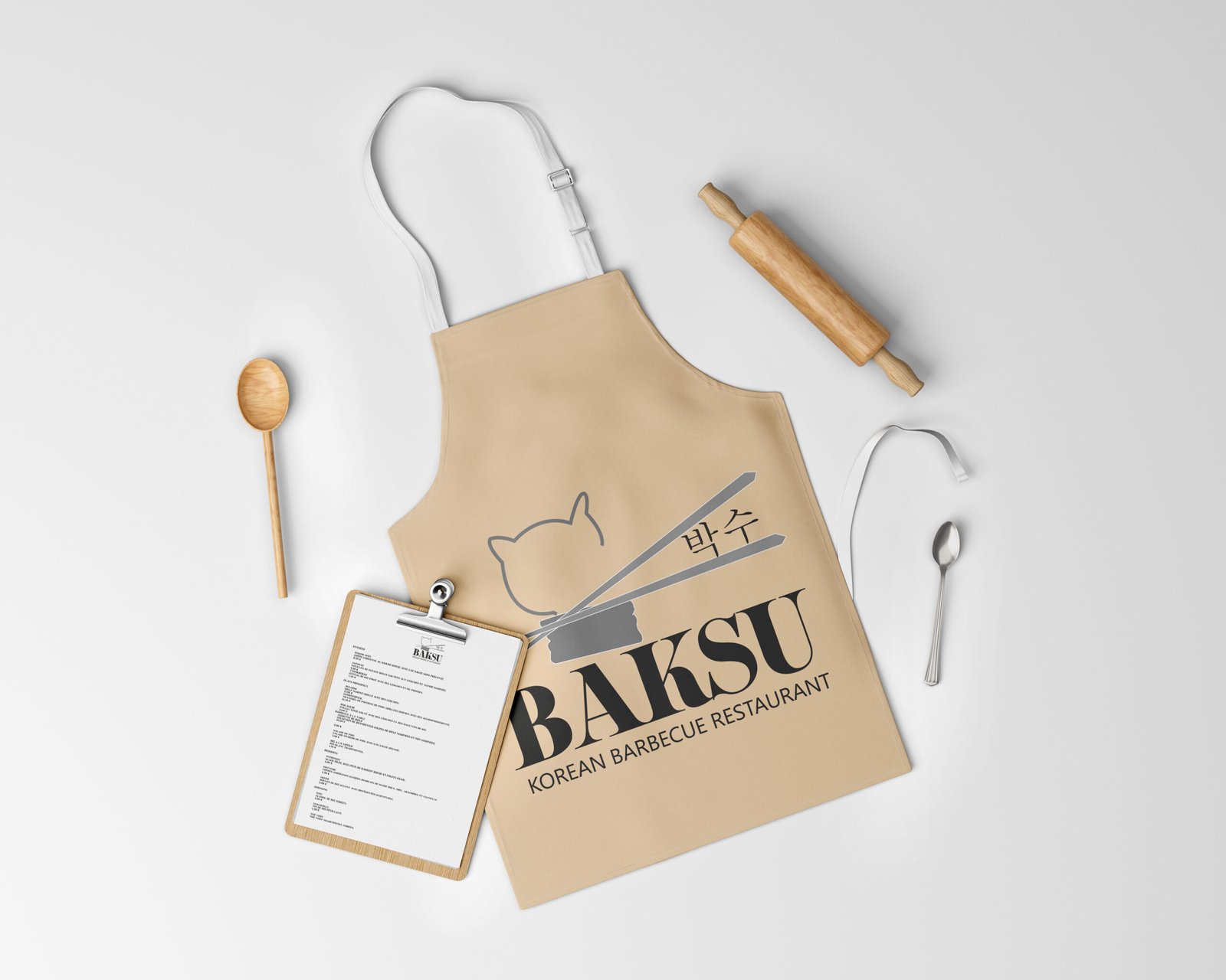 Les baguettes croisées et le mot 박수 (« applaudissements ») inscrivent le logo dans une ambiance typiquement coréenne, festive et accessible.