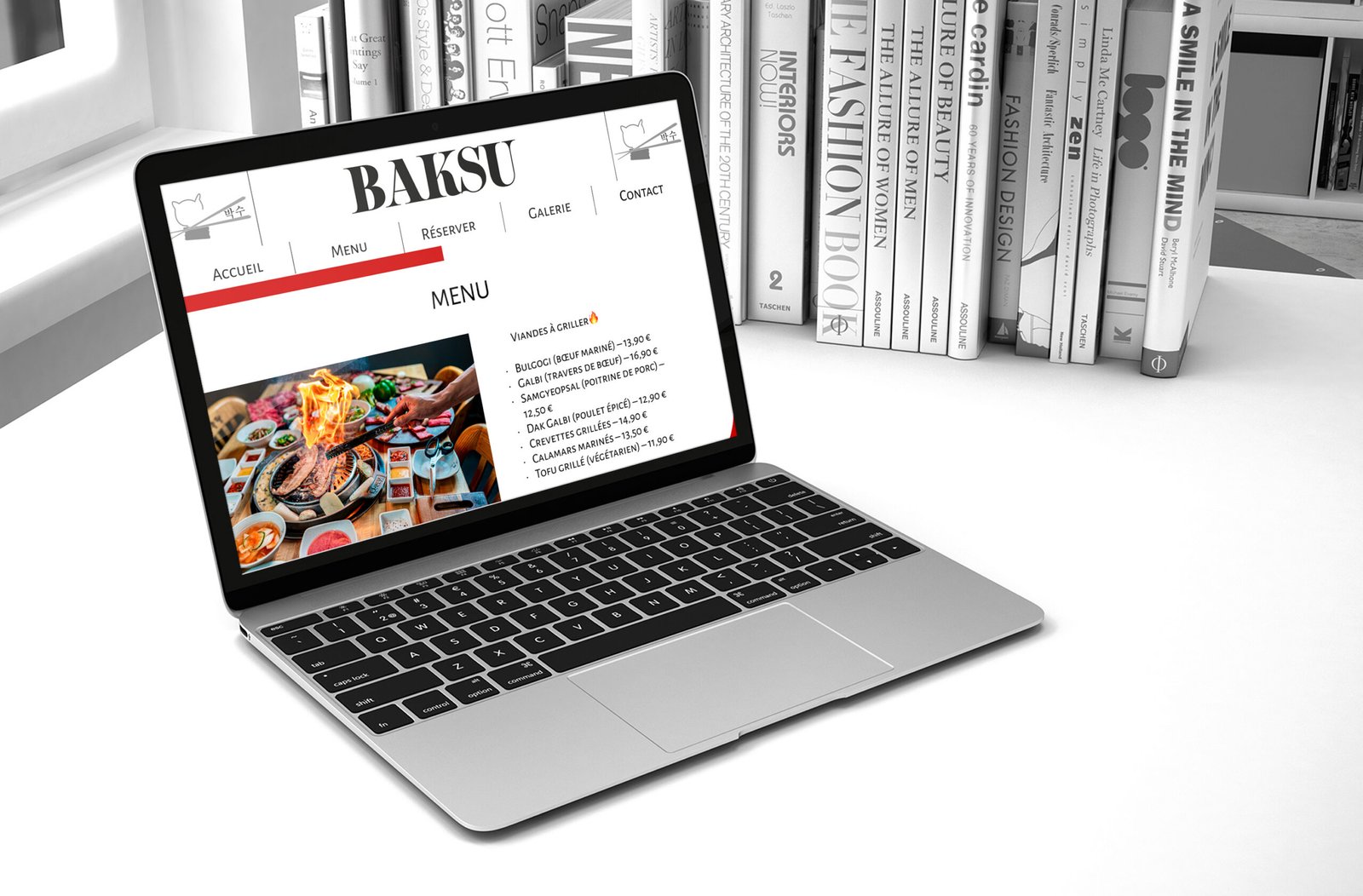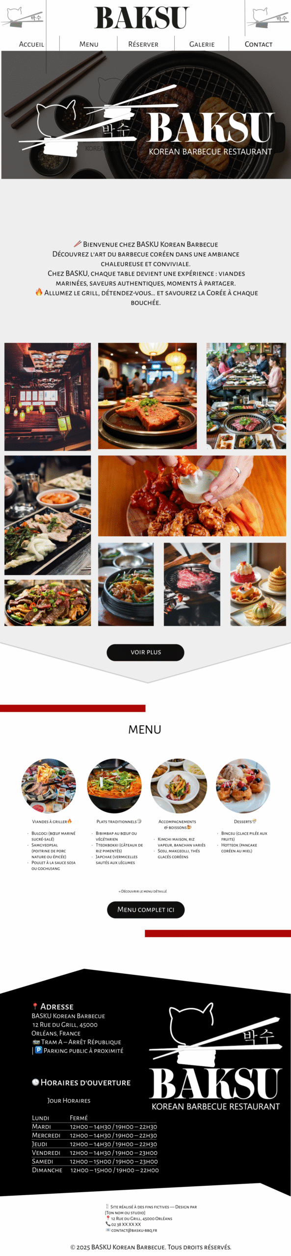 BAKSU est un site vitrine imaginé pour un restaurant de barbecue coréen. Ce projet m’a permis de travailler un univers visuel chaleureux et authentique, en mettant en avant la convivialité, l’ambiance et la richesse des plats traditionnels coréens.