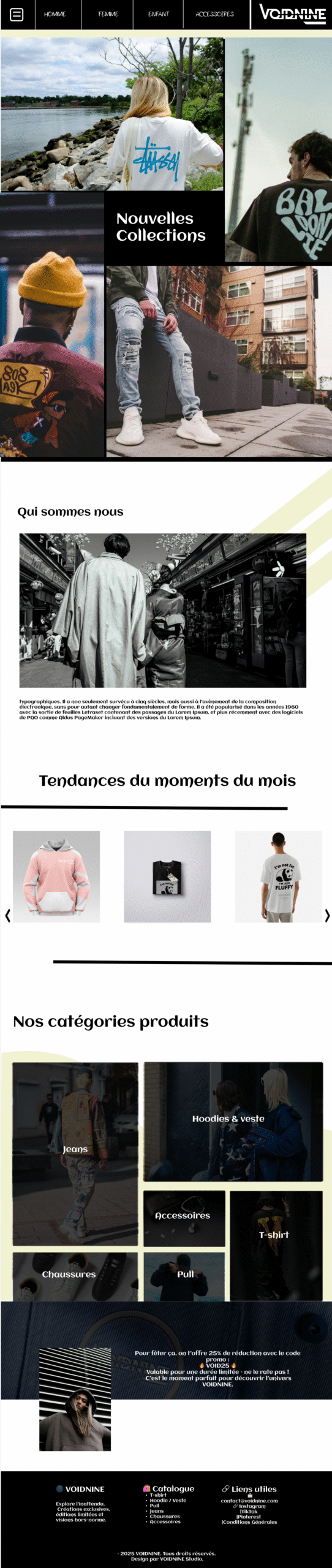 J’ai réaliser le site de VOIDNINE est une boutique en ligne imaginée pour une marque de streetwear. L’objectif principal était de créer un univers visuel audacieux, minimaliste et impactant, reflétant l’identité de la marque : moderne, graphique, et assumée.